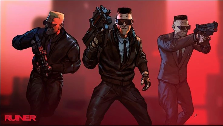 As one would expect for the first enemy variants of the game, by Ruiner standards, Guards are fairly easy to deal with, wielding weaker slower weapons and having less accurate fire and slower movements; they tend to be enemies Puppy can win direct fire fights with if the Player is careful. However they tend to ally themselves with Homing Mines in combat which can disrupt the flow of combat. Regardless they have the most predictable fighting pattern of any humanoid enemy.
